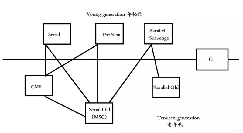 这些回收器都是基于分代的,把 G1 除外,按回收的分代划分,横线以上的 3 种:Serial ,ParNew, Parellel Scavenge 都是回收新生代的,横线以下的 3 种:CMS,Serial Old, Parallel Old 都是回收老年代的。