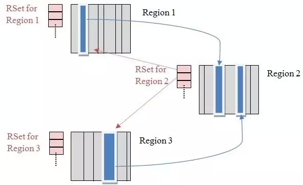 - Remembered Sets:简称 RSets,用于根据每个 region 里的对象,是从哪指向过来的(即:谁引用了我),每个 Region 都有独立的 RSets。(Other Region -> Self Region)。