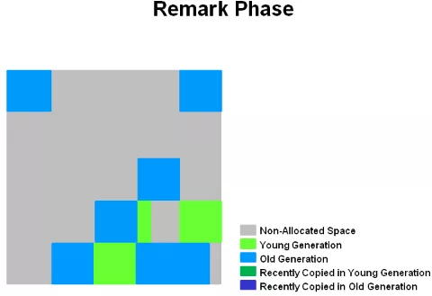 - 3)Remark 再标志:为啥还要再标记一次?因为第 2 步并没有阻塞其它工作线程,其它线程在标识过程中,很有可能会产生新的垃圾。