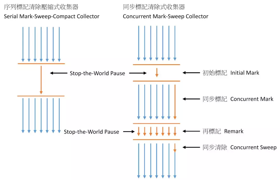 全称:Concurrent Mark Sweep,从名字上看,就能猜出它是并发多线程的。这是 JDK 7 中广泛使用的收集器,有必要多说一下,借一张网友的图说话: