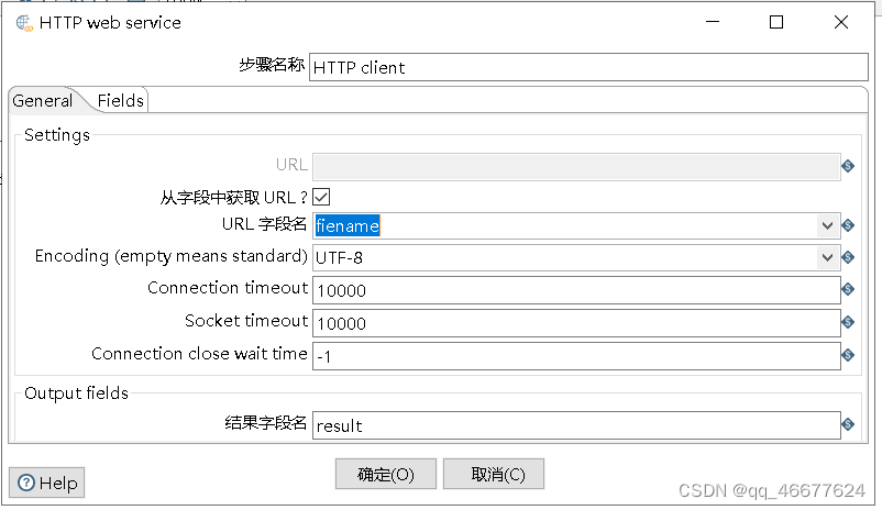 双击“HTTP client”控件,进入“HTTP web service”界面。勾选“从字段中获取URL?”的复选框;在“URL字段名”处的下拉框中选择URL字段名,即filename;在“结果字段名”处指定结果字段名称,这里选择默认的结果字段result。“HTTP client”控件配置的效果如图所示。