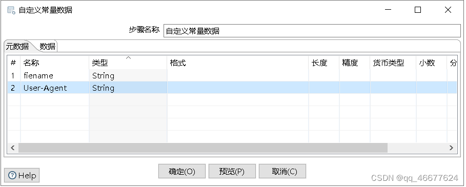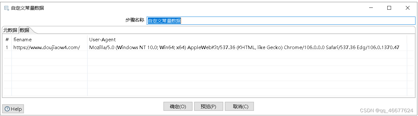 单击“元数据”选项卡,定义一个字段常量filename和User-Agent并指定数据类型String;单击“数据”选项卡,在字段常量filename添加html形式数据所在的URL,即https://movie.douban.com/chart;在字段常量User-Agent添加用户代理,即“Mozilla/5.0(Windows NT 10.0;Win64;x64;rv;82.0)Gecko/20100101 Firefox/82.0”,具体效果如下图:
