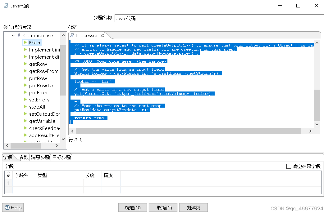 双击“Java”控件,进入“Java代码”界面。双击“Code Snippits”→ “Common use”→ “Main”,添加Java脚本代码的主方法,即程序入口。