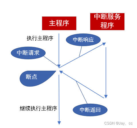1、中断发生:当CPU在处理某一事件A时,发生了另一事件B,请求 CPU迅速去处理