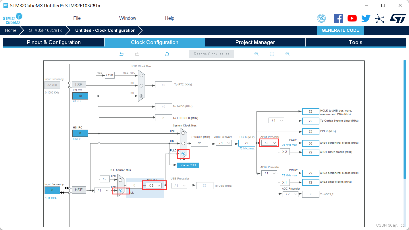 首先选择高速外部时钟作为系统时钟的输入,然后时钟树具体配置如下