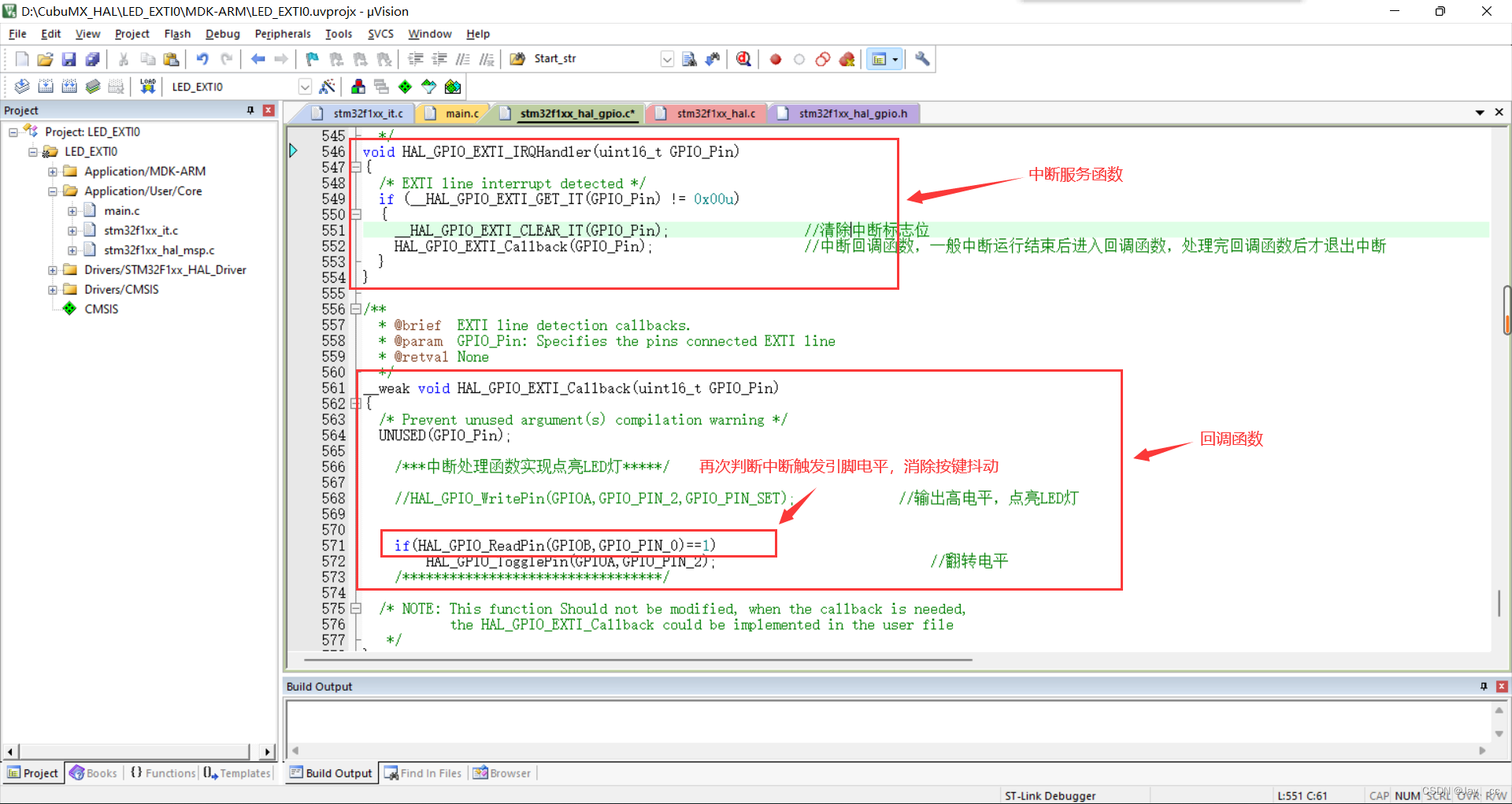 中断服务函数执行完后进入回调函数,我们就可以在回调函数里面编写我们需要执行的中断服务