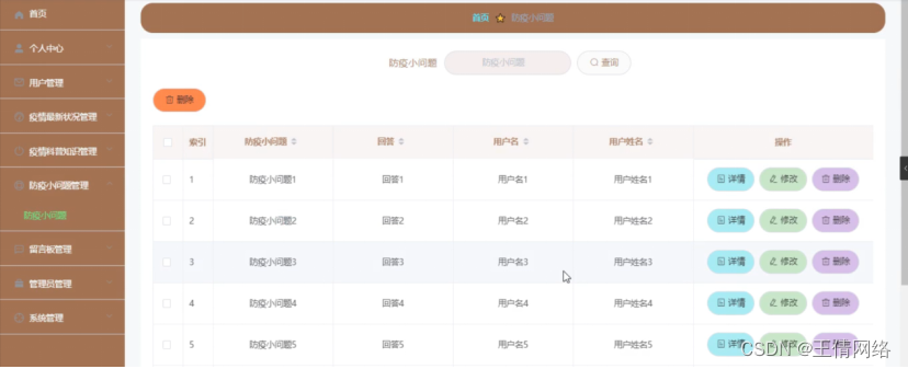 防疫小问题管理,在防疫小问题管理页面中可以查看索引、防疫小问题、回答、用户名、用户姓名等信息,并可根据需要进行修改或删除等操作,如图4-12所示。