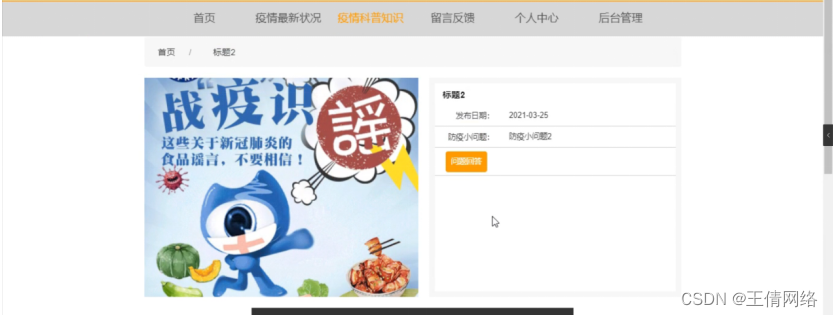 疫情科普知识,在疫情科普知识页面可以查看标题、图片、视频、发布日期、防疫小问题等信息,如图4-4所示。