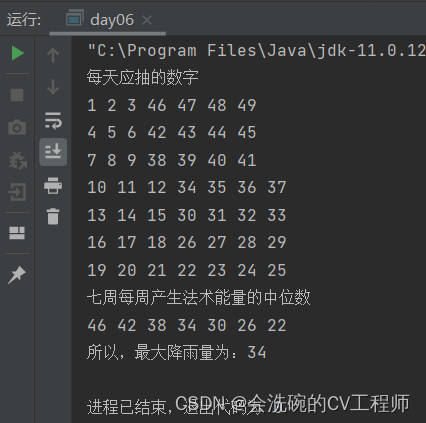 每周,小明施展法术产生的能量为这周7张法术符上数字的中位数。法术施展完7周后,求雨将获得成功,降雨量为7周能量的中位数。
