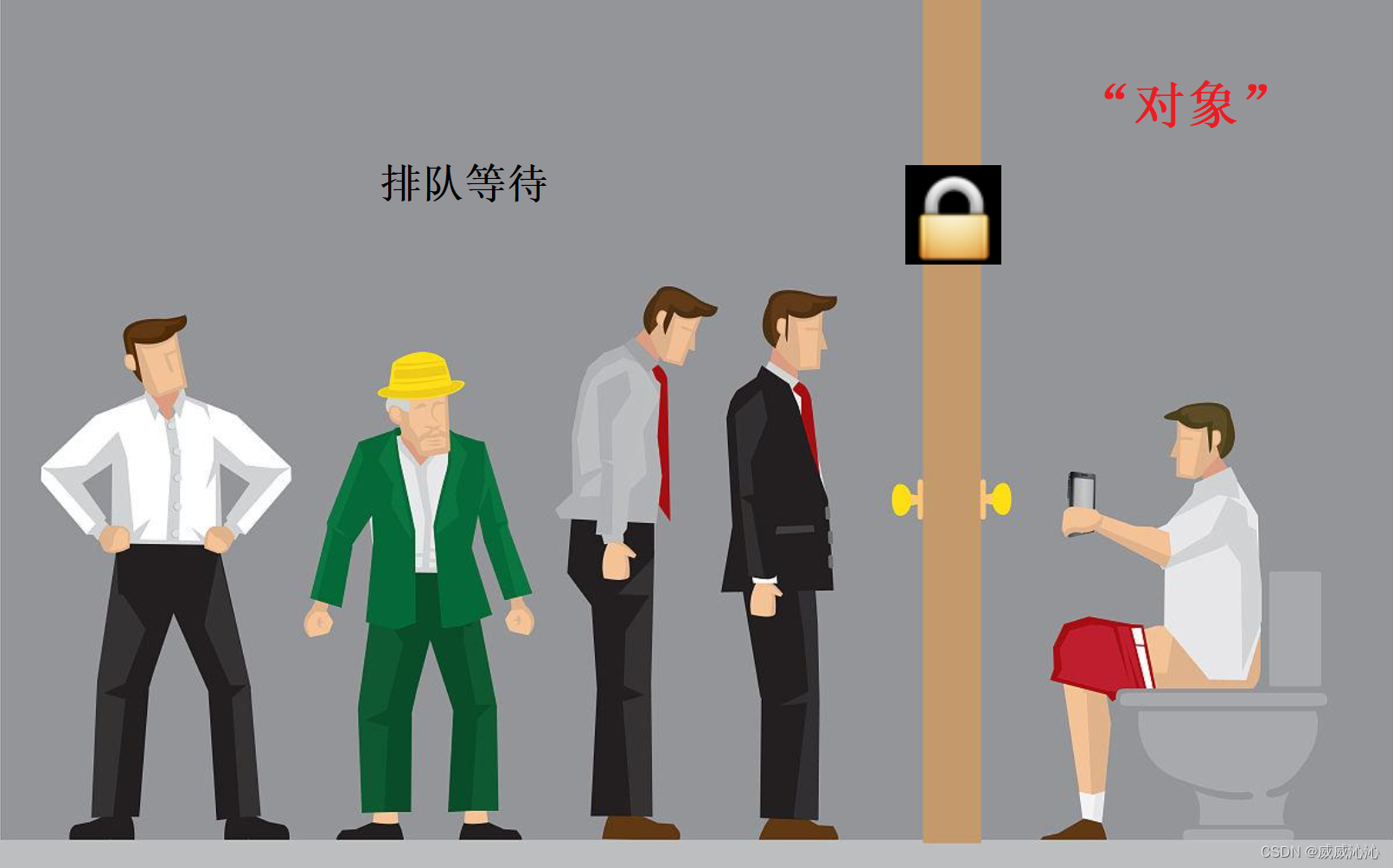 当一个线程占用厕所(“对象”),并上锁时,其他线程就只能排队等待(阻塞),直到这个线程释放该“对象”(释放)。