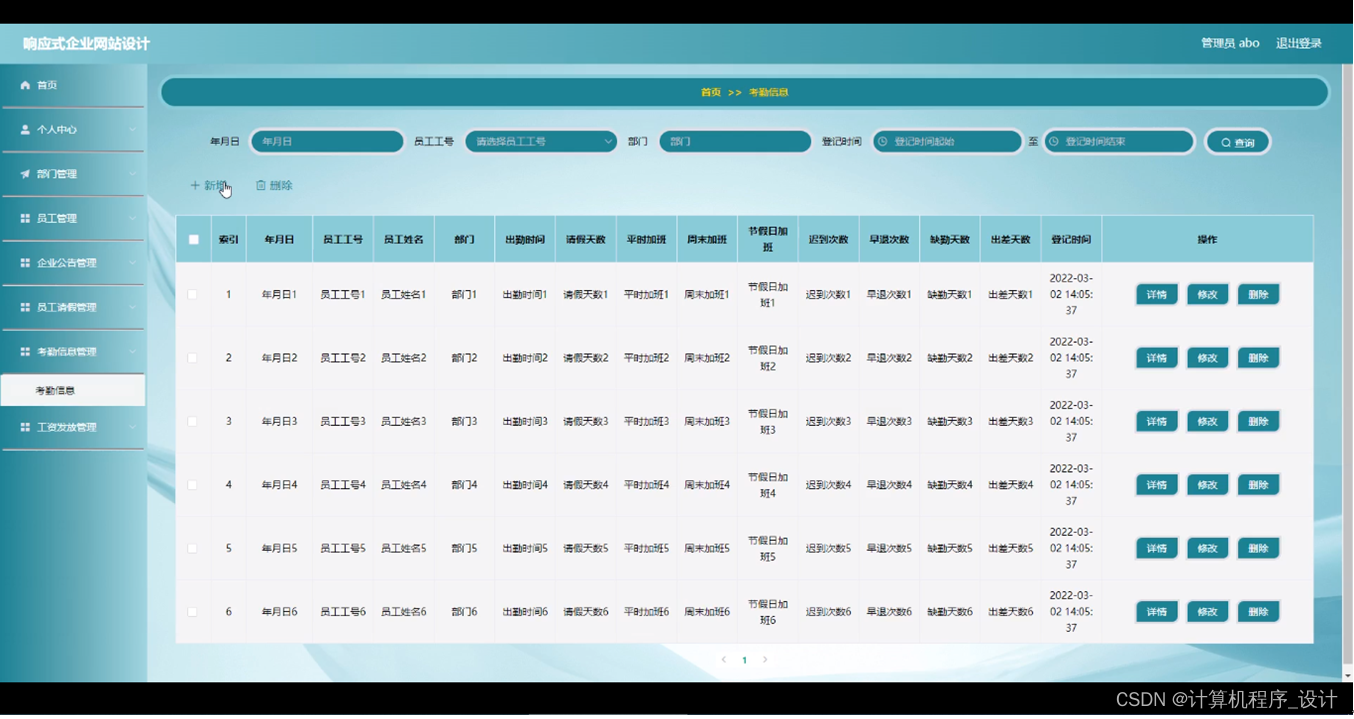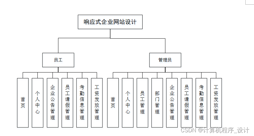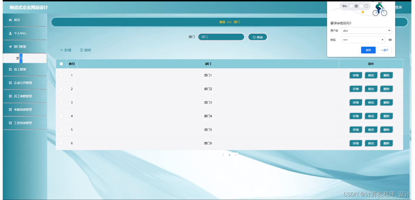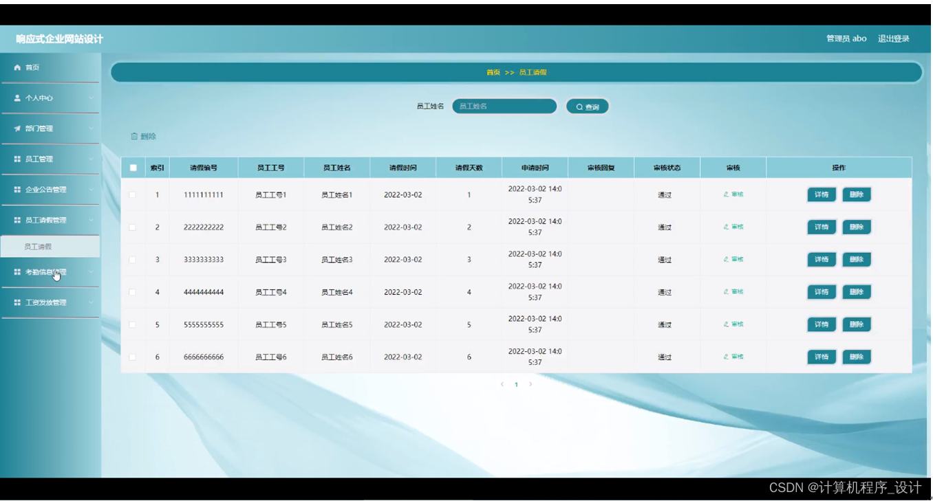 管理员登录进入响应式企业网站设计系统可以查看首页,个人中心,部门管理,员工管理,企业公告管理,员工请假管理,考勤信息管理,工资发放管理等内容进行详细操作,如图5-4所示。