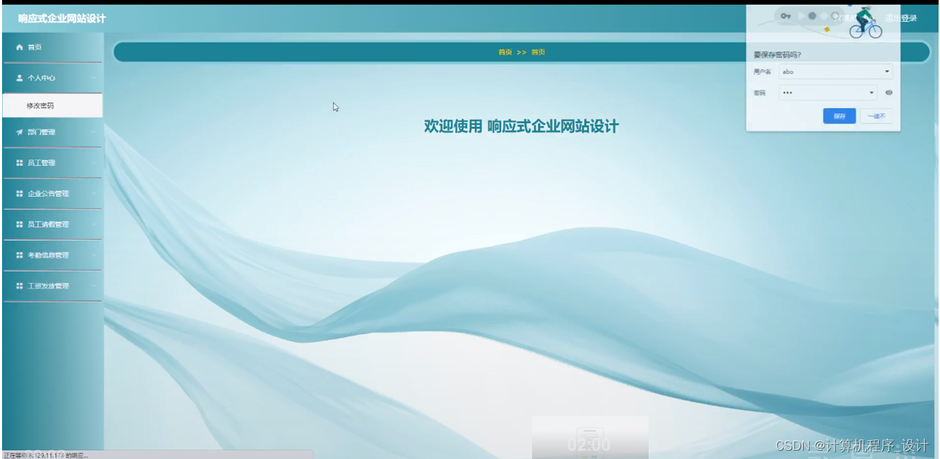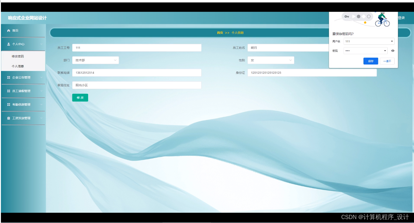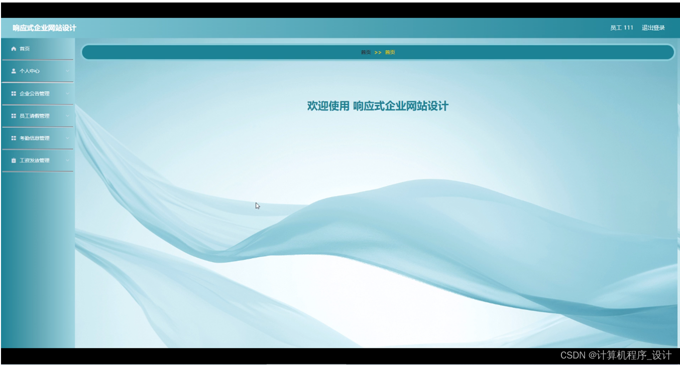 员工登录进入响应式企业网站可以查看首页,个人中心,企业公告管理,员工请假管理,考勤信息管理,工资发放管理等内容进行详细操作,如图5-10所示。