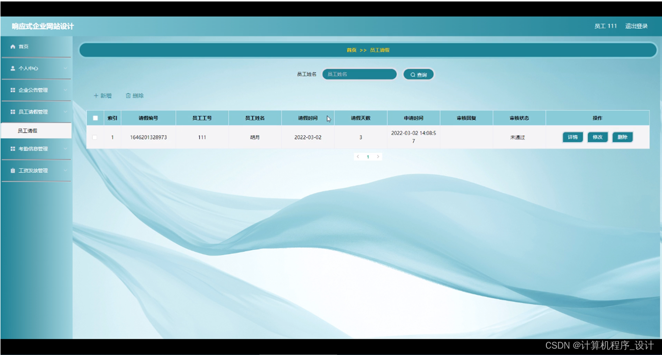 员工请假管理,在员工请假管理页面可以对索引,请假编号,员工工号,员工姓名,请假时间,请假天数,申请时间,审核回复,审核状态等内容进行详情,修改和删除等操作,如图5-12所示。