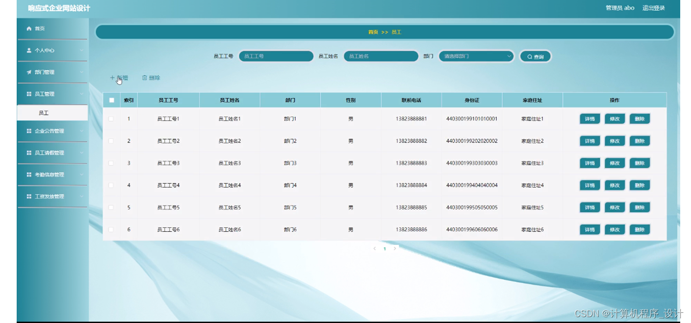 员工管理,在员工管理页面可以对索引,员工工号,员工姓名,部门,性别,联系电话,身份证,家庭住址等内容进行详情,修改或删除等操作,如图5-6所示。