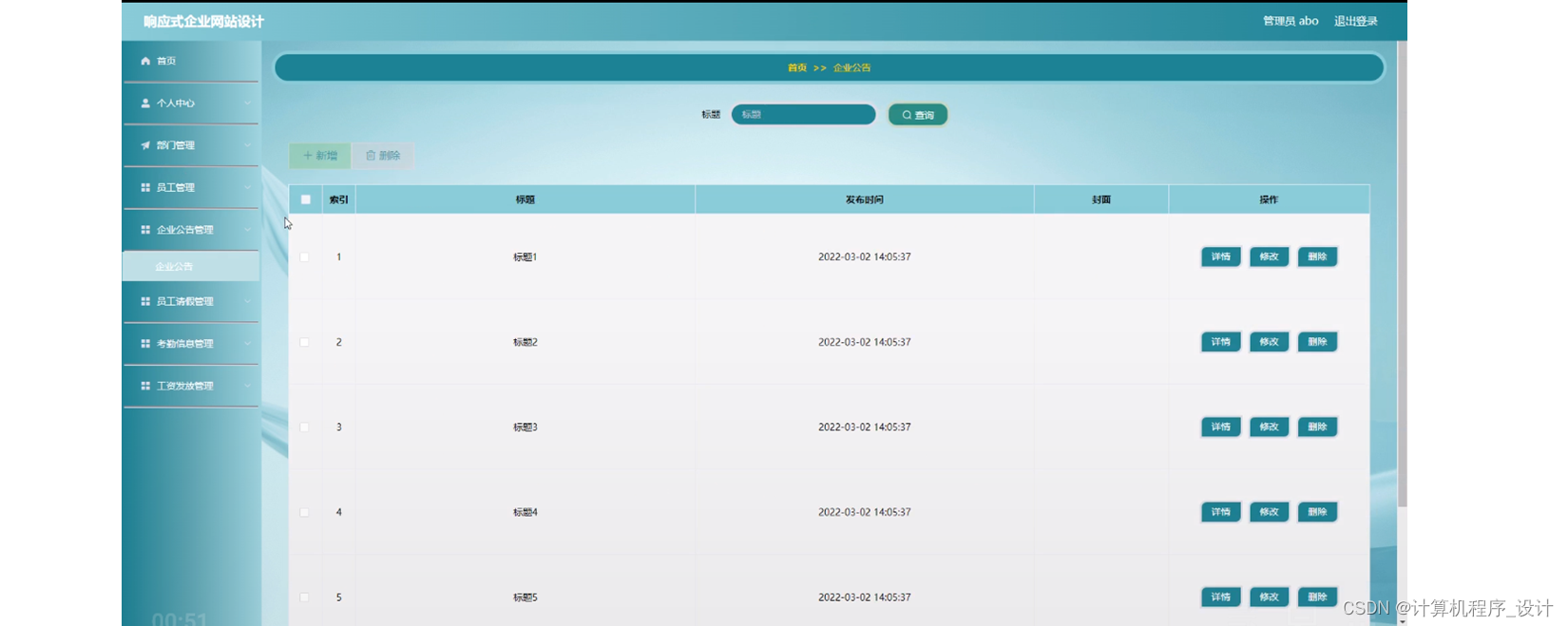企业公告管理,在企业公告管理页面可以对索引,标题,发布时间,封面等内容进行详情、修改或删除等操作,如图5-7所示。
