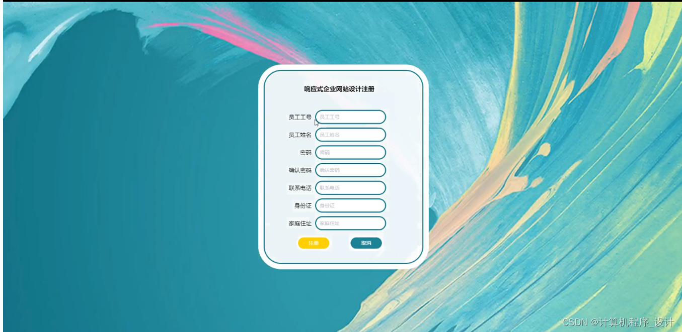 员工注册,在员工注册页面,通过填写员工工号,员工姓名,密码,确认密码,联系电话,身份证,家庭住址等内容进行注册操作,如图5-2所示。