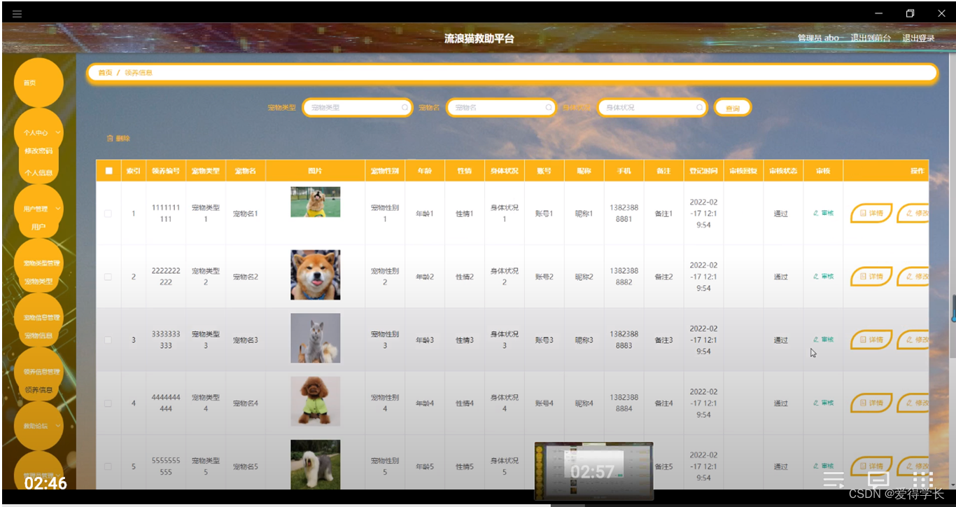领养信息管理,在领养信息管理页面可以对索引,领养编号,宠物类型,宠物名,图片,宠物性别,年龄,性情,身体状况,账号,昵称,手机,备注,登记时间,审核回复,审核状态,审核等内容进行详情,修改和删除等操作,如图5-10所示。