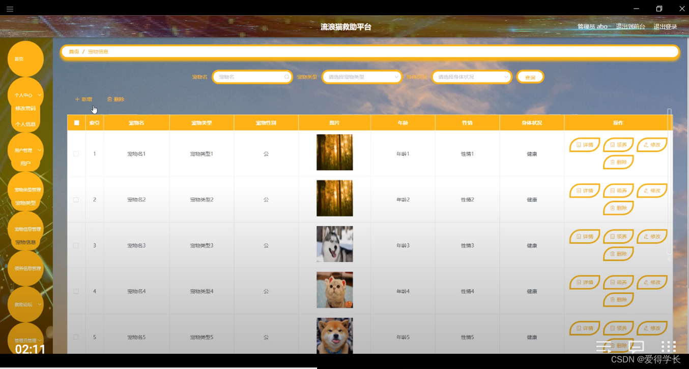 宠物信息管理,在宠物信息管理页面可以对索引,宠物名,宠物类型,宠物性别,图片,年龄,性情,身体状况等内容进行详情,领养,修改和删除等操作,如图5-9所示。