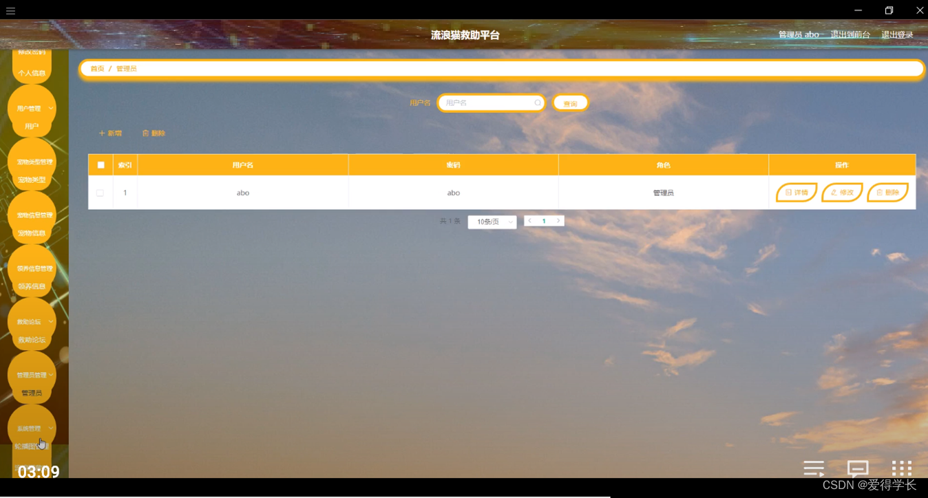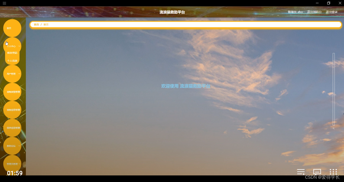 管理员登陆系统后,可以查看首页,个人中心,用户管理,宠物类型管理,宠物信息管理,领养信息管理,救助论坛,管理员管理,系统管理等功能,还能对每个功能逐一进行相应操作,如图5-6所示。