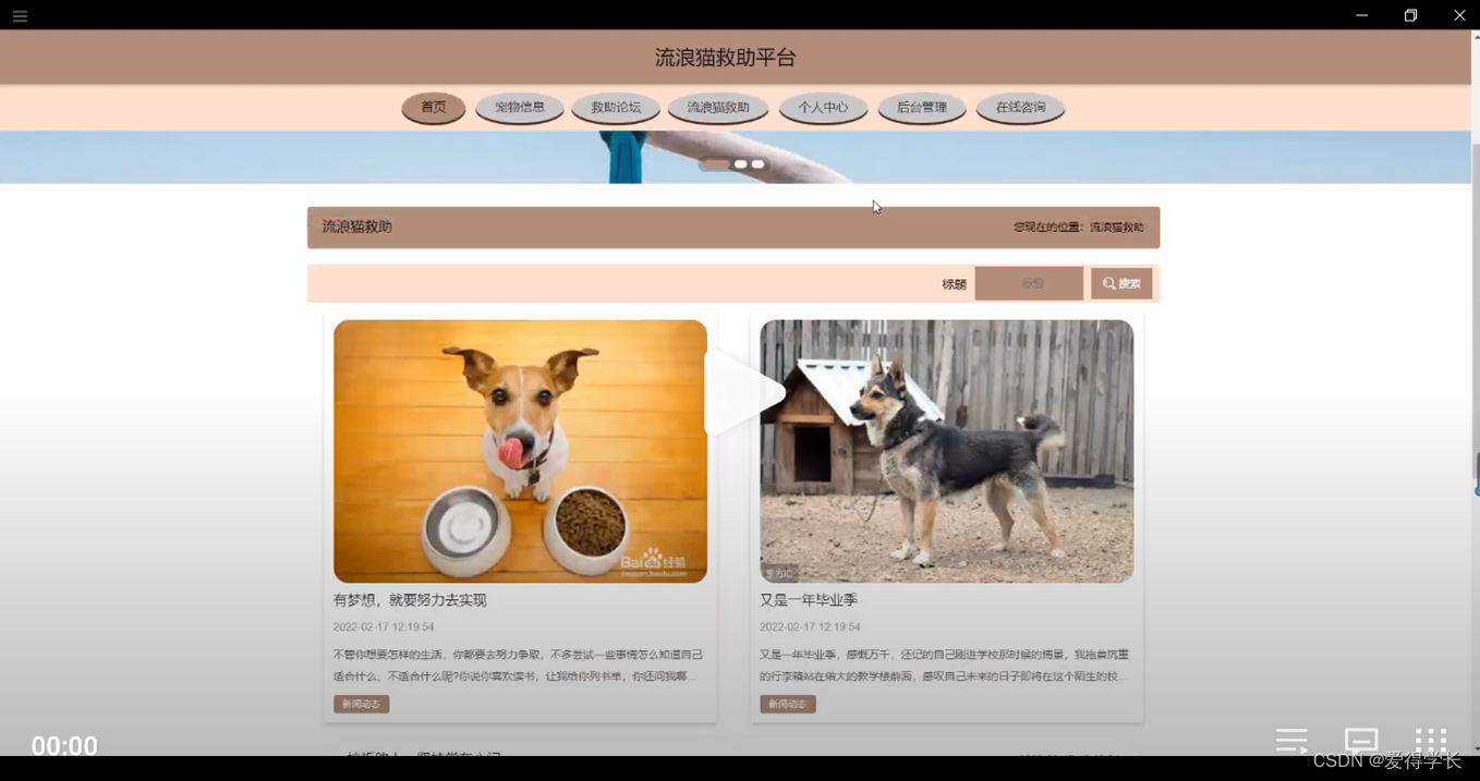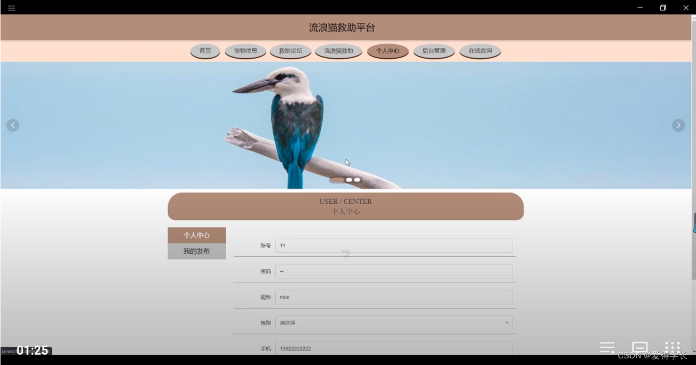 流浪猫救助平台,在平台首页可以查看首页,宠物信息,救助论坛,个人中心,后台管理,在线咨询等内容,并进行详细操作;如图5-1所示。