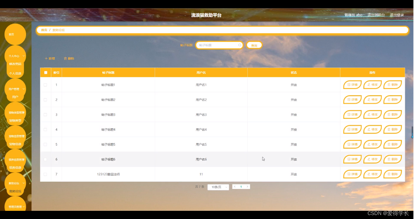 救助论坛,在救助论坛页面可以对索引,帖子标题,用户名,状态等内容进行详情,修改和删除等操作,如图5-12所示。
