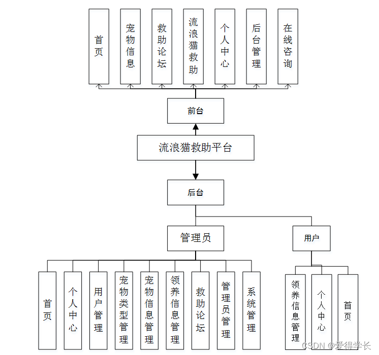 为了更好的去理清本系统整体思路,对该系统以结构图的形式表达出来,设计实现该流浪猫救助平台的功能结构图如下所示: