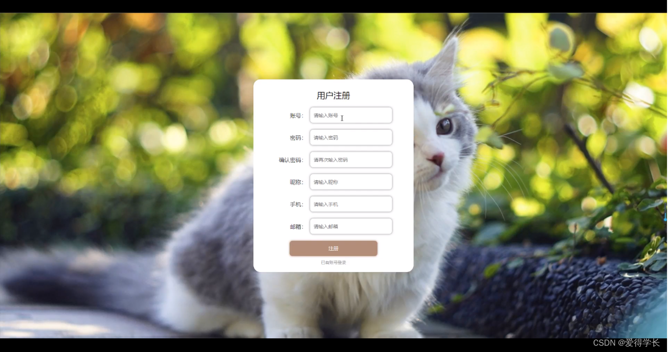 用户注册,在用户注册页面通过填写账号,密码,确认密码,昵称,手机,邮箱等信息进行注册操作,如图5-2所示。
