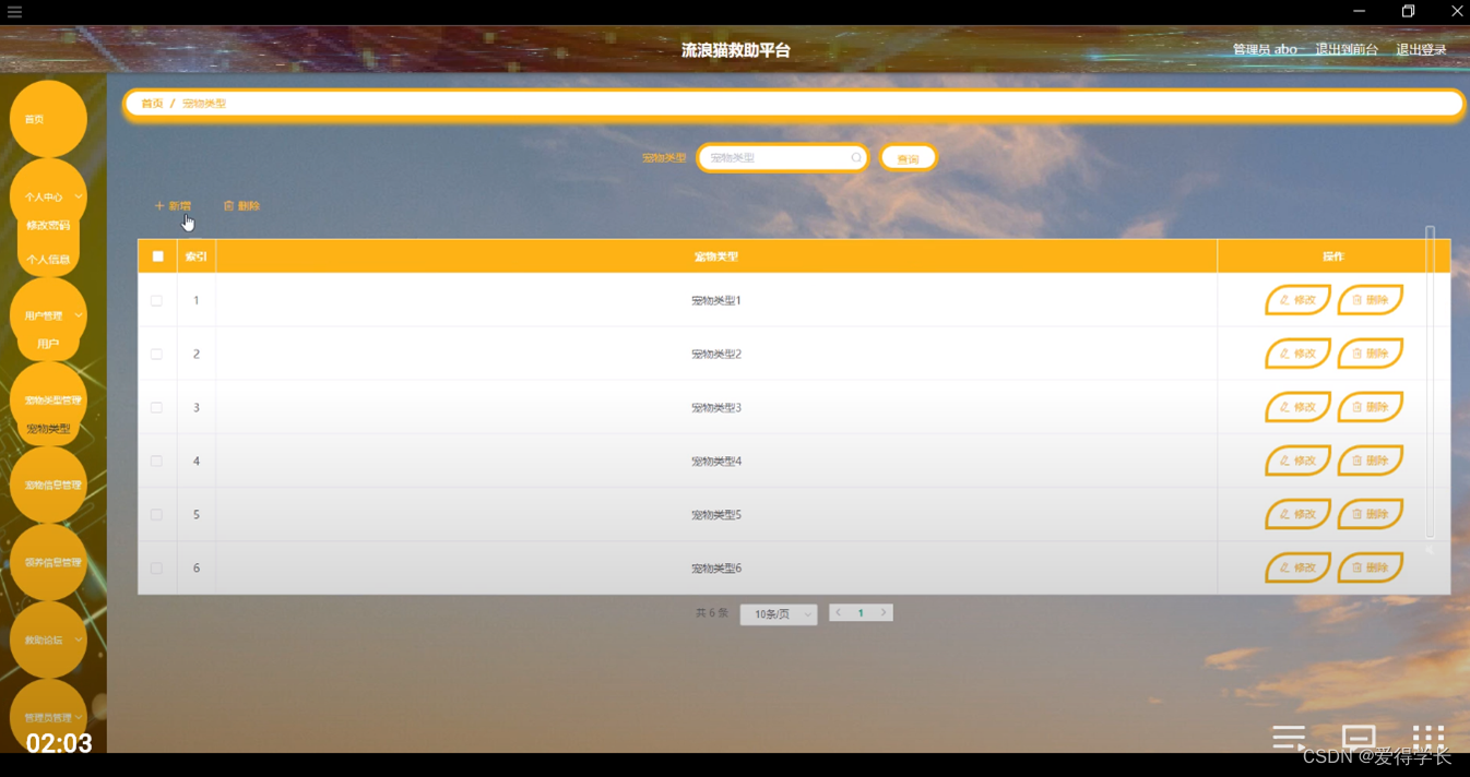 宠物类型管理,在宠物类型管理页面可以对索引,宠物类型,等内容进行修改和删除等操作,如图5-8所示。