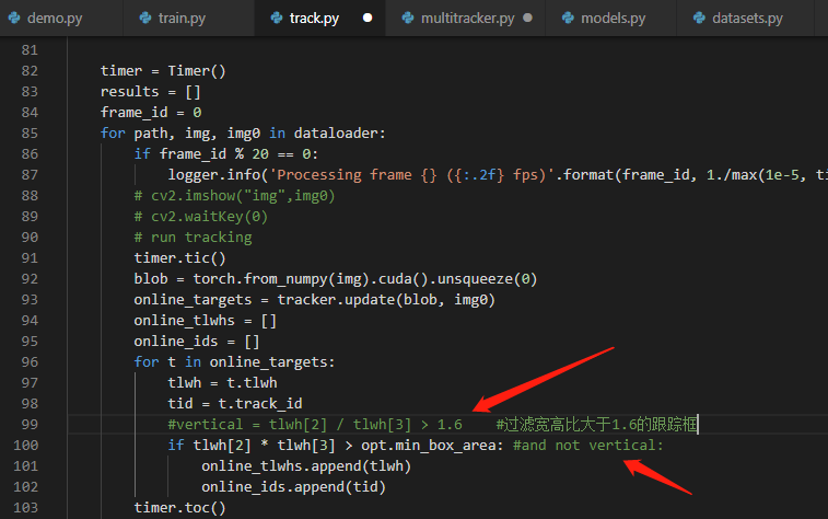 由于JDE原始是做行人跟踪,所以过滤掉了宽高比大于1.6的跟踪框,所以导致很多符合这种比例的车辆全部被过滤,显示不出来。好了到此问题查清楚了,注释掉过滤语句,重新跑demo,天下太平,一切正常了。