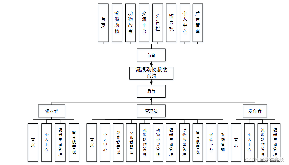 统主要包括首页,个人中心,领养者管理,发布者管理,流浪动物管理,动物种类管理,领养申请管理,动物故事管理,留言板管理,交流平台,系统管理等功能,以及后台数据库管理。