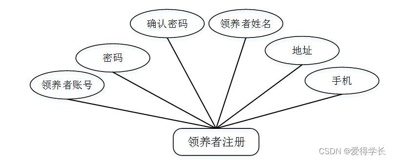 领养者注册信息实体包括领养者账号,密码,确认密码,领养者姓名,领养者手机,领养者地址等属性。领养者注册信息实体图如图4-2所示: