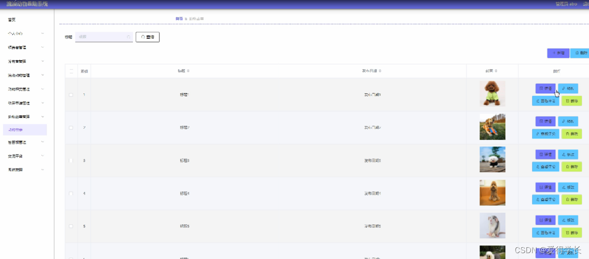 动物故事管理;在动物故事管理页面可以对索引,标题,发布日期等内容进行详情,修改,查看评论和删除等操作,如图5-10所示。