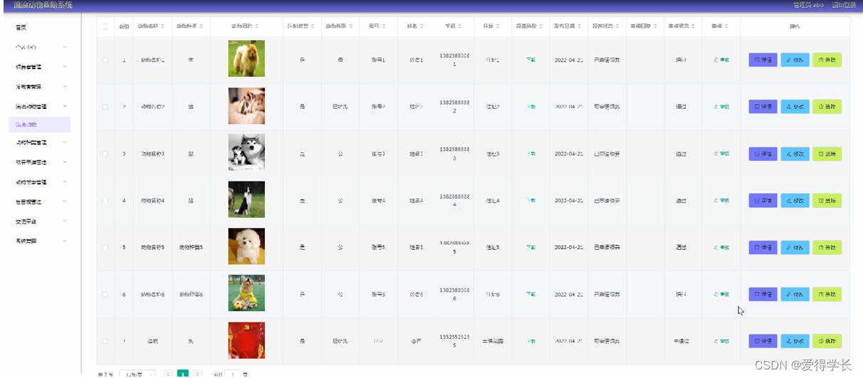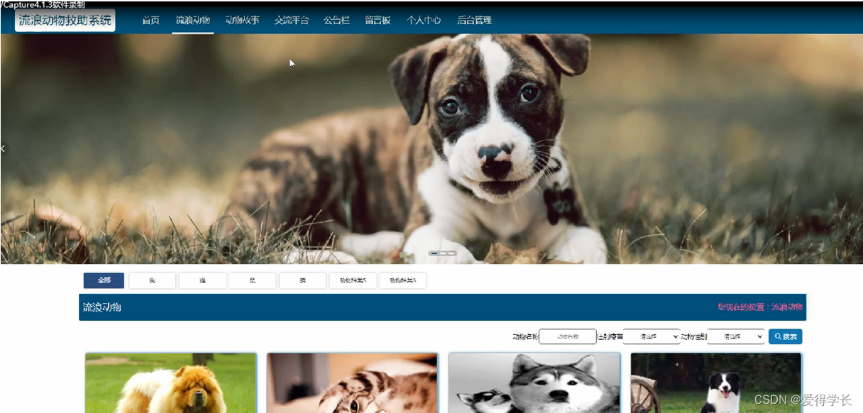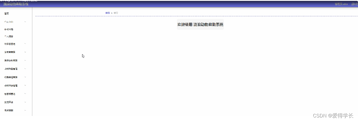 3、主页内容管理:管理员登录以后,可以对首页,个人中心,领养者管理,发布者管理,流浪动物管理,动物种类管理,领养申请管理,动物故事管理,留言板管理,交流平台,系统管理进行详细操作。