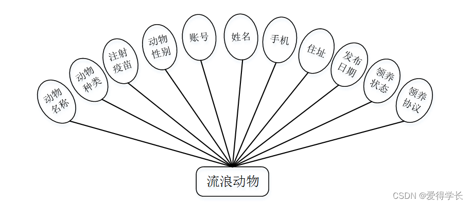 流浪动物实体包括动物名称,动物种类,注射疫苗,动物性别,账号,姓名,手机,住址,发布日期,领养状态,领养协议等属性;流浪动物实体图如图4-3所示: