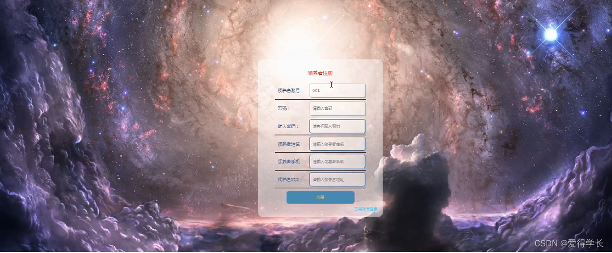 领养者注册;在领养者注册页面通过填写领养者账号,密码,确认密码,领养者姓名,领养者手机,领养者地址等信息完成用户注册操作,如图5-4所示。