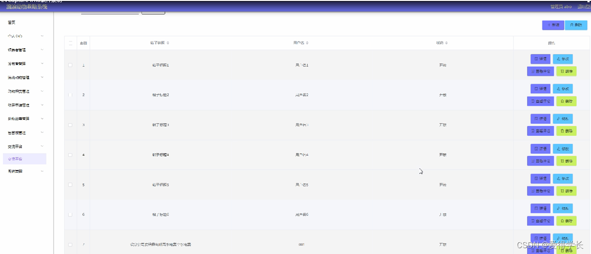 交流平台;在交流平台页面可以对索引,帖子标题,用户名,状态等内容进行详情,修改,查看评论和删除等操作,如图5-12所示。