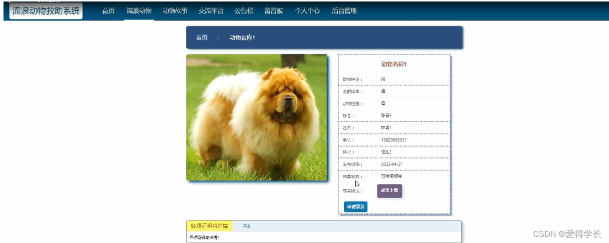 流浪动物;在流浪动物页面可以查看动物名称,动物种类,注射疫苗,动物性别,账号,姓名,手机,住址,发布日期,领养状态,领养协议等详细内容,并进行申请领养,评论操作,如图5-5所示。