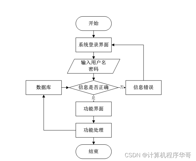 用户打开并进入系统后,会先显示登录界面,输入正确的用户名和密码,系统自动检测信息,若信息无误,则用户会进入系统功能界面,进行操作,否则会提示错误无法登录,操作流程如图3-3所示。