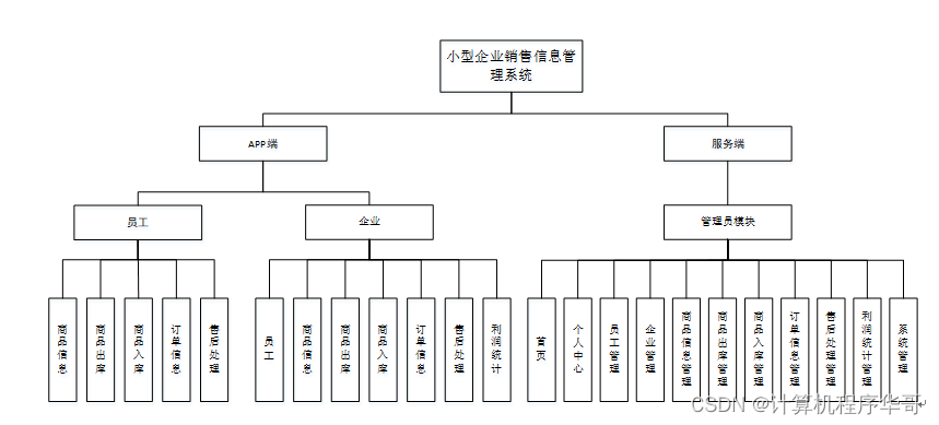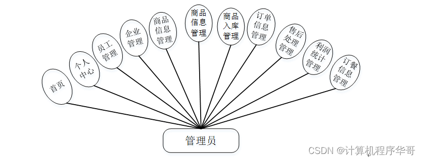 系统中的核心用户是系统管理员,管理员登录后,通过管理员菜单来管理后台系统。主要功能有:首页、个人中心、员工管理、企业管理、商品信息管理、商品出库管理、商品入库管理、订单信息管理、售后处理管理、利润统计管理、系统管理等功能。服务端用例如图3-7所示。