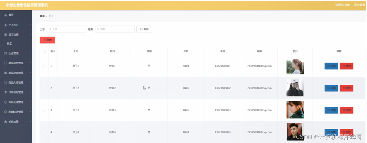 员工管理,在员工管理页面可以对索引、工号、姓名、性别、年龄、手机、邮箱、图片等内容进行详情或删除等操作,如图5-10所示。