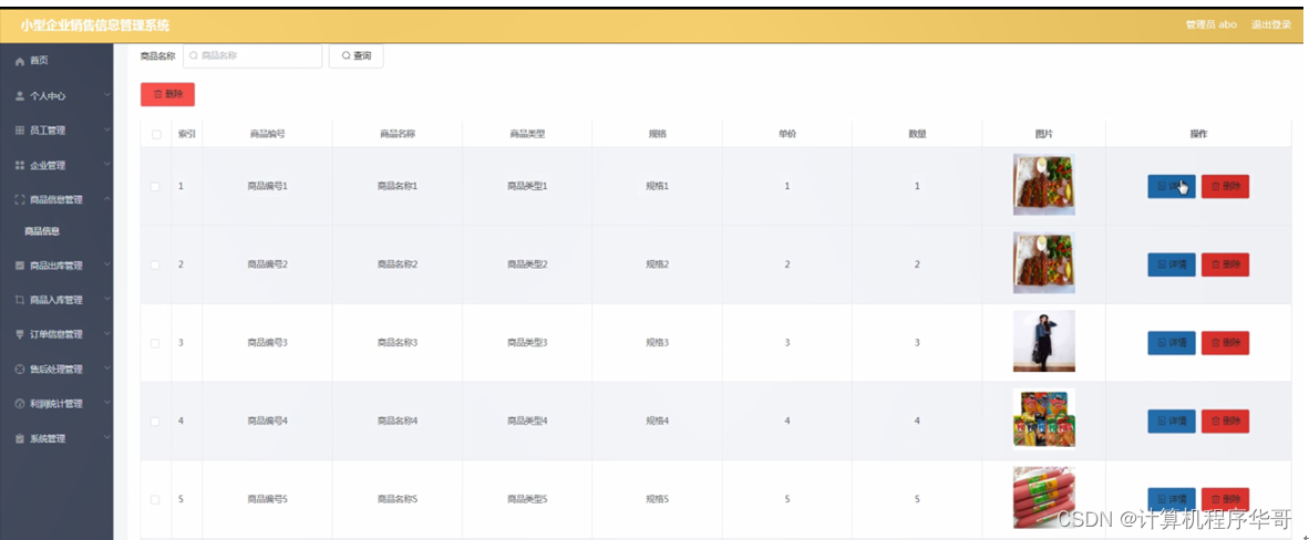 商品信息管理,在商品信息管理页面可以对索引、商品编号、商品名称、商品类型、规格、单价、数量、图片等内容进行详情或删除等操作,如图5-12所示。