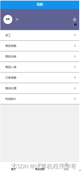 企业,在我的页面可以对员工、商品信息、商品出库、商品入库、订单信息、售后处理、利润统计等详细信息进行操作,如图5-6所示。
