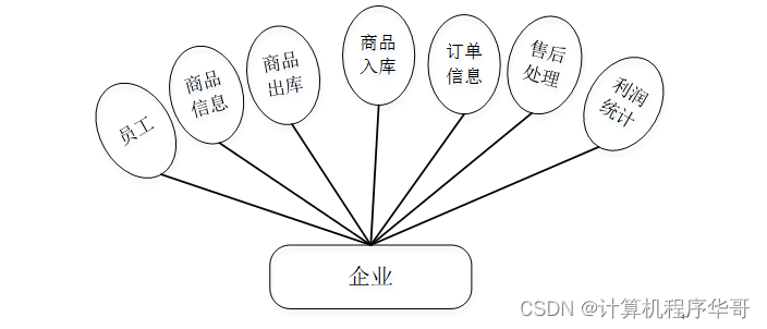企业实现功能包括员工、商品信息、商品出库、商品入库、订单信息、售后处理、利润统计等功能。企业用例如图3-8所示。