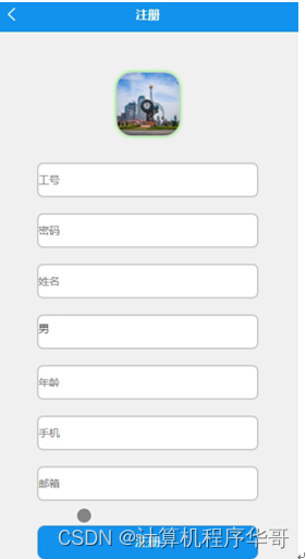 员工注册,在员工注册页面通过填写工号、密码、姓名、性别、年龄、手机、邮箱等信息进行注册操作;如图5-2所示。