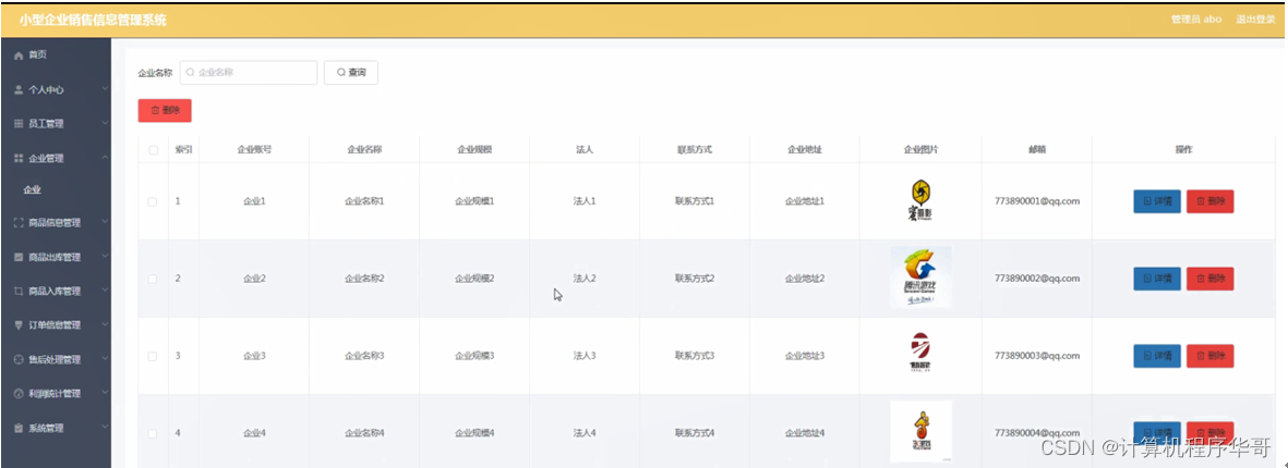 企业管理,在企业管理页面可以对索引、企业账号、企业名称、企业规模、法人、联系方式、企业地址、 企业图片、邮箱等内容进行详情或删除等操作,如图5-11所示。