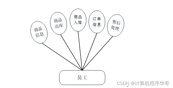 员工实现功能包括商品信息、商品出库、商品入库、订单信息、售后处理等功能。员工用例如图3-9所示。