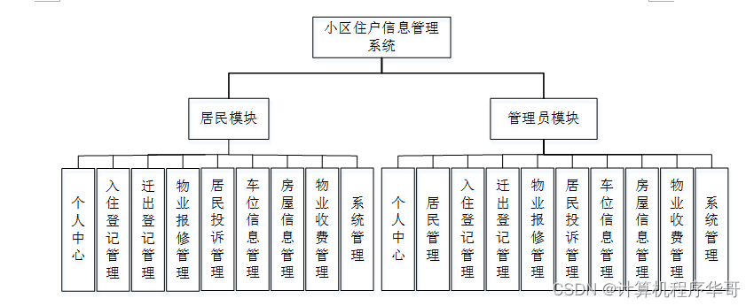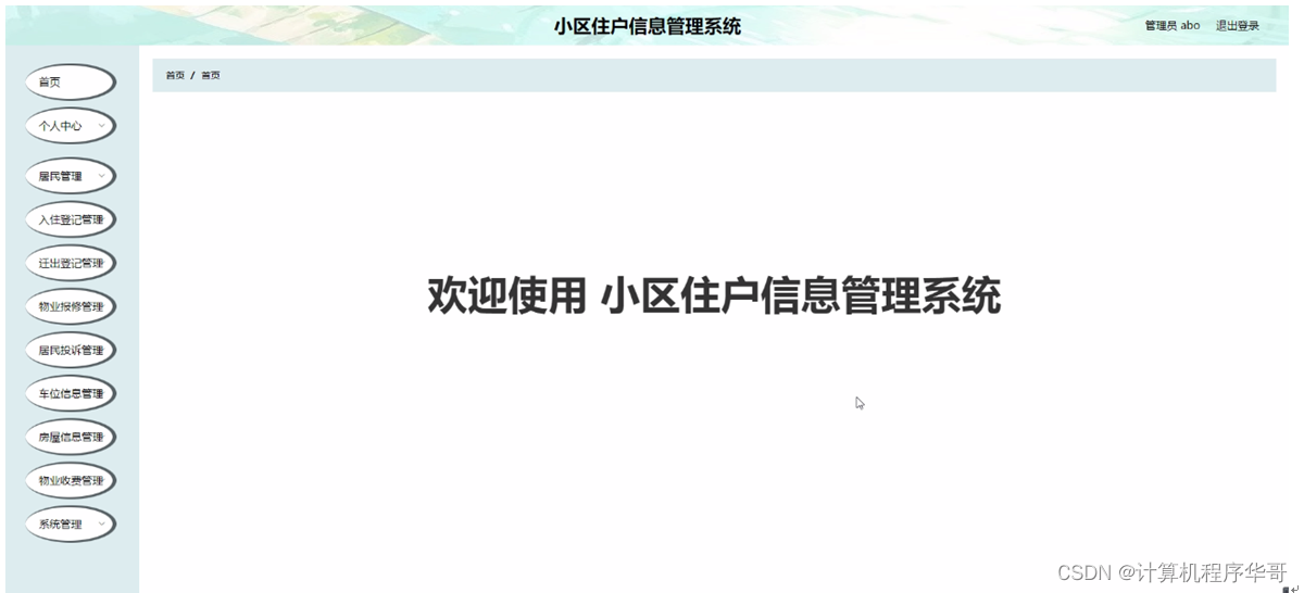 管理员通过登录进入小区住户信息管理系统可查看个人中心、居民管理、入住登记管理、迁出登记管理、物业报修管理、居民投诉管理、车位信息管理、房屋信息管理、物业收费管理、系统管理等内容,如图5-2所示。