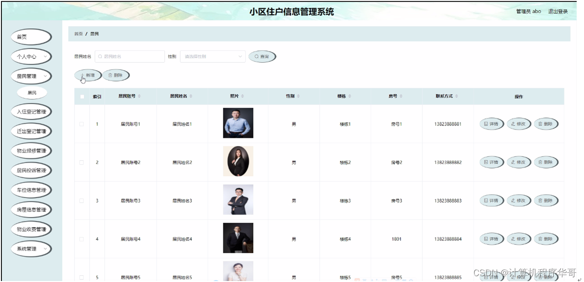 居民管理, 管理员可在居民管理页面查看居民账号、居民姓名、照片、性别、楼栋、房号、联系方式等内容,还可进行新增、修改或删除等操作,如图5-3所示。