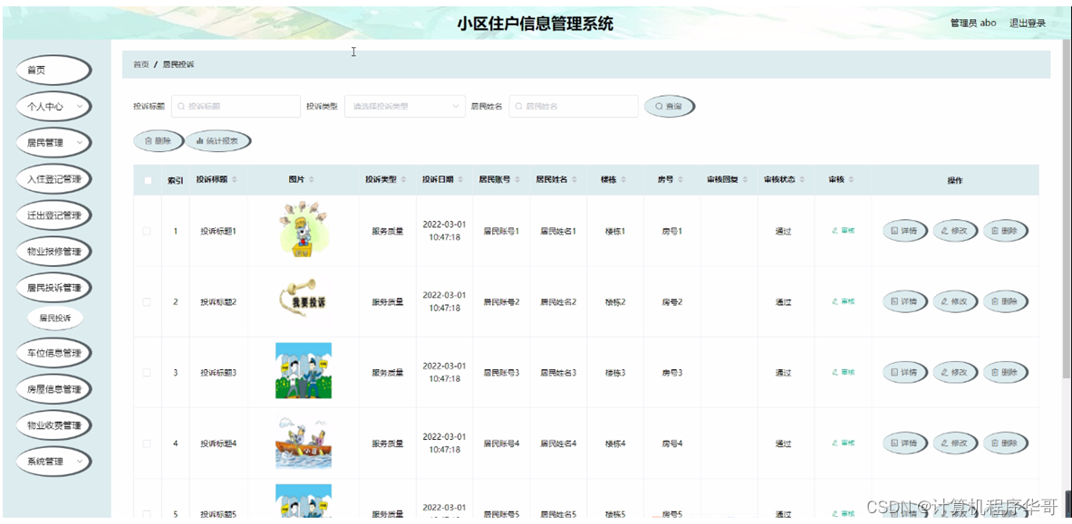居民投诉管理,管理员可在居民投诉管理页面查看投诉标题、图片、投诉类型、投诉日期、居民账号、居民姓名、楼栋、房号、审核回复、审核状态等内容,还可进行修改、统计、审核或删除等操作,如图5-7所示。