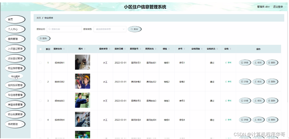 物业报修管理,管理员可在物业报修管理页面查看报修名称、图片、报修类型、报修日期、居民账号、居民姓名、楼栋、房号、审核回复、审核状态等内容,还可进行修改、审核或删除等操作,如图5-6所示。